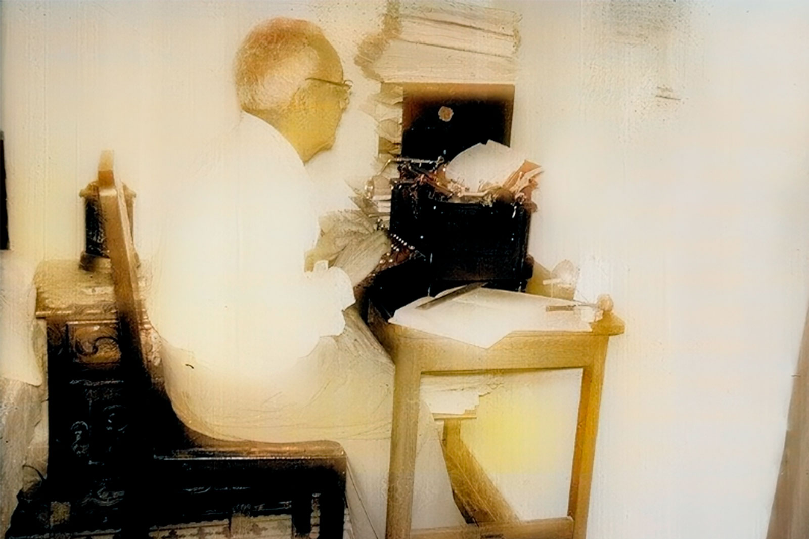 Don Emilio Pérez Arcos fue un escritor independiente, que con su pluma y maquina de escribir dedico gran parte de su vida a luchar por sus ideales, ayudar a la gestión de servicios urbanos e investigar la historia de México, sentado en esta silla frente a su escritorio, redacto sus grandes obras y escritos para el bienestar de su región de origen y en la Ciudad de México donde también fue pilar importante en el desarrollo de la zona donde vivió después de su exilio de su natal San Juan Atenco Puebla.